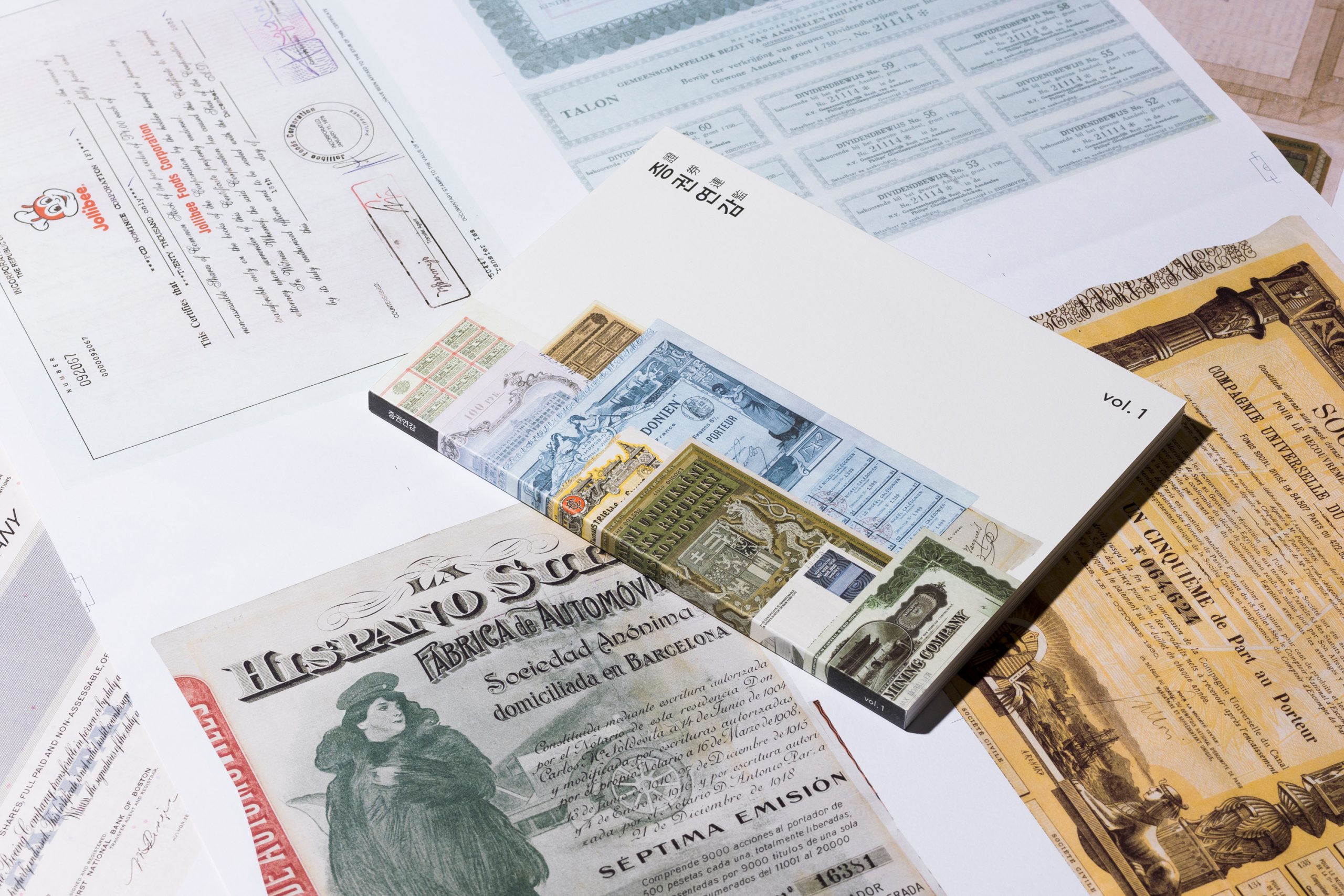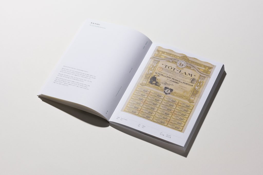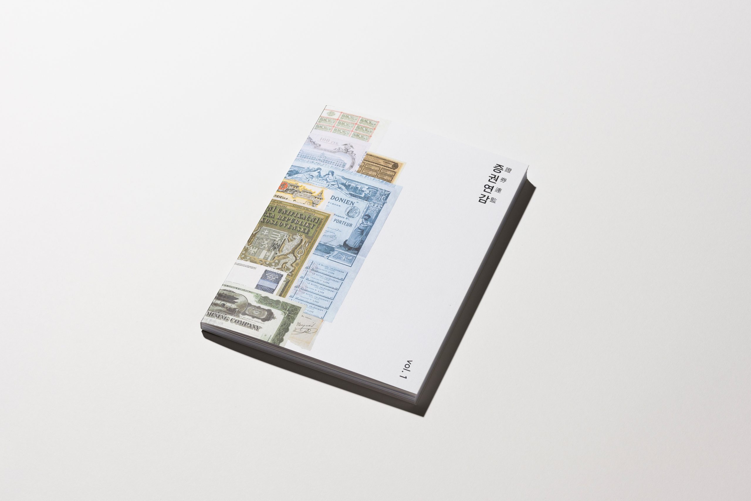 증권연감 證券連鑑 Vol. 1은 증권박물관 웹사이트 “이달의 증권” 코너에 2017년 부터 2018년까지 소개된 세계의 증권 유물을 모은 책입니다. 프렌치 폴드 제본을 적용한 내지의 안쪽 면을 통해 실제 크기 증권을 엿볼 수 있습니다.