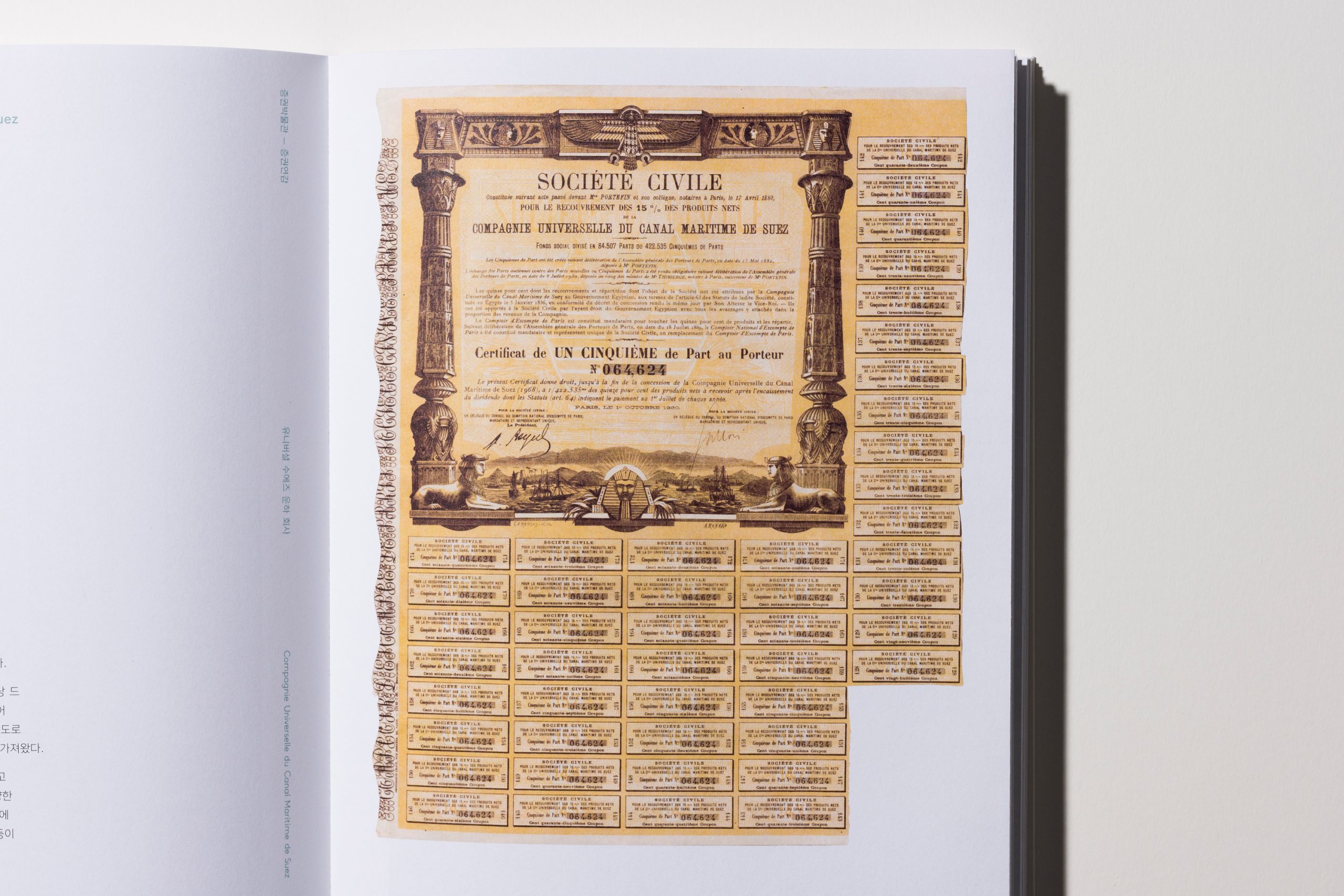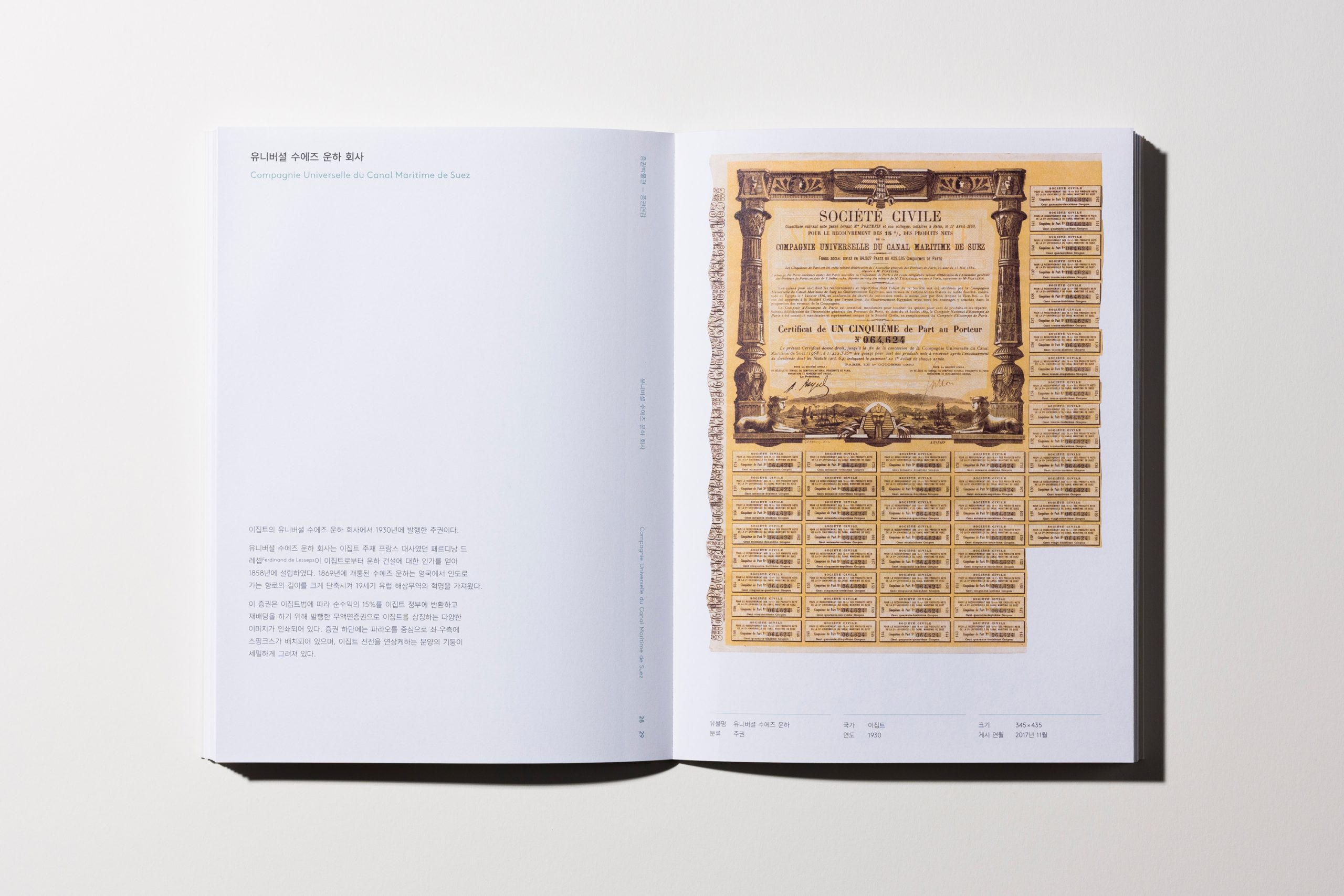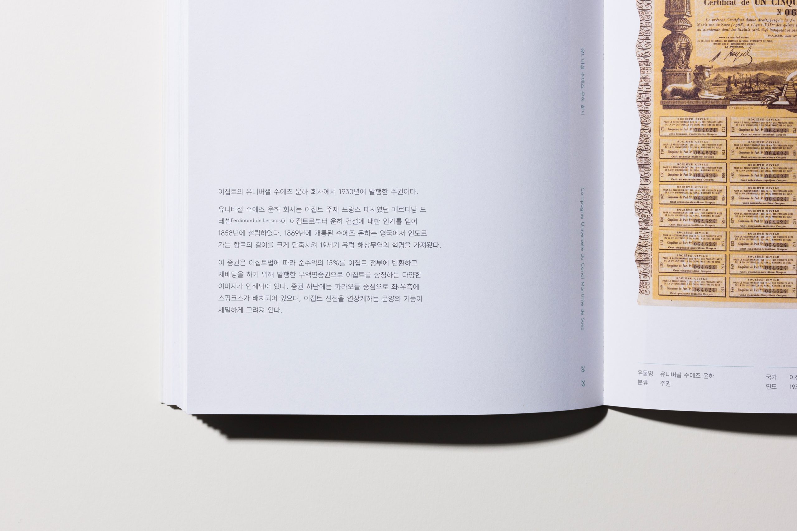 증권연감 證券連鑑 Vol. 1은 증권박물관 웹사이트 “이달의 증권” 코너에 2017년 부터 2018년까지 소개된 세계의 증권 유물을 모은 책입니다. 프렌치 폴드 제본을 적용한 내지의 안쪽 면을 통해 실제 크기 증권을 엿볼 수 있습니다.