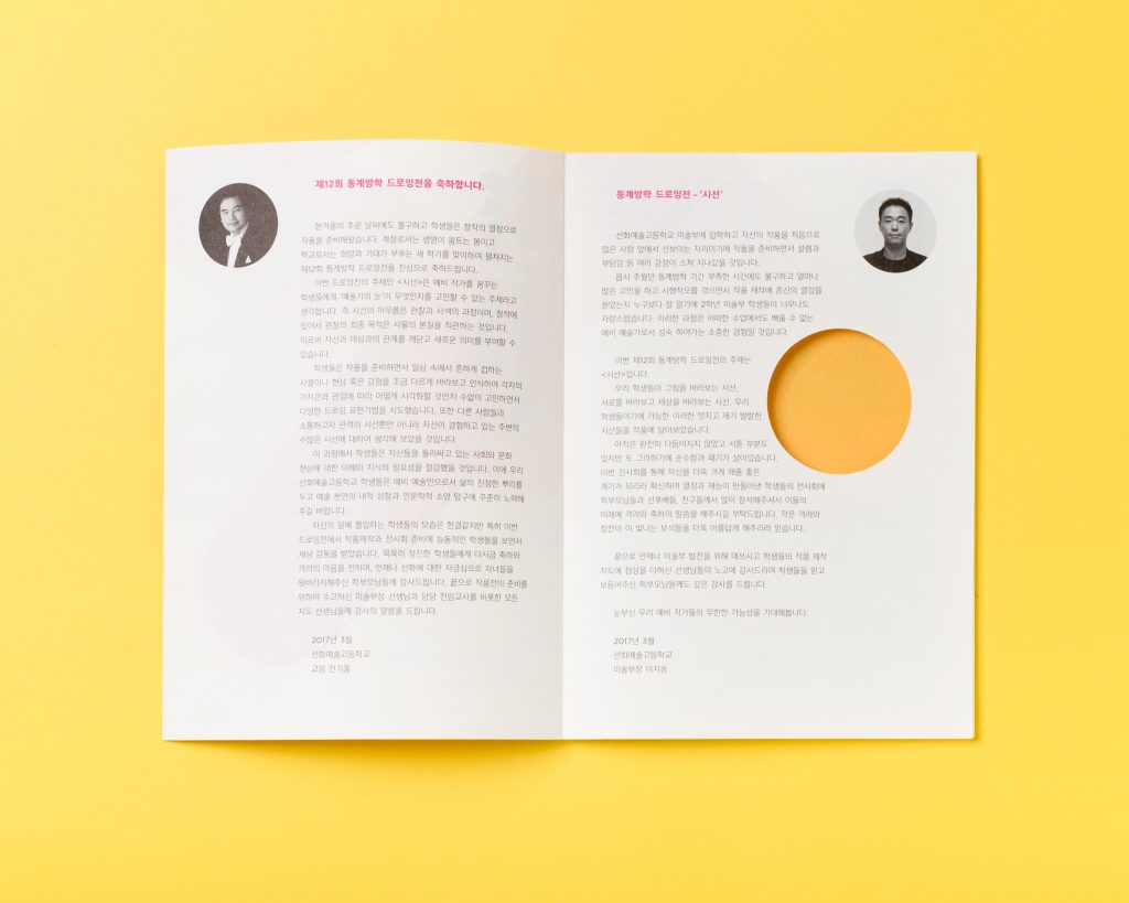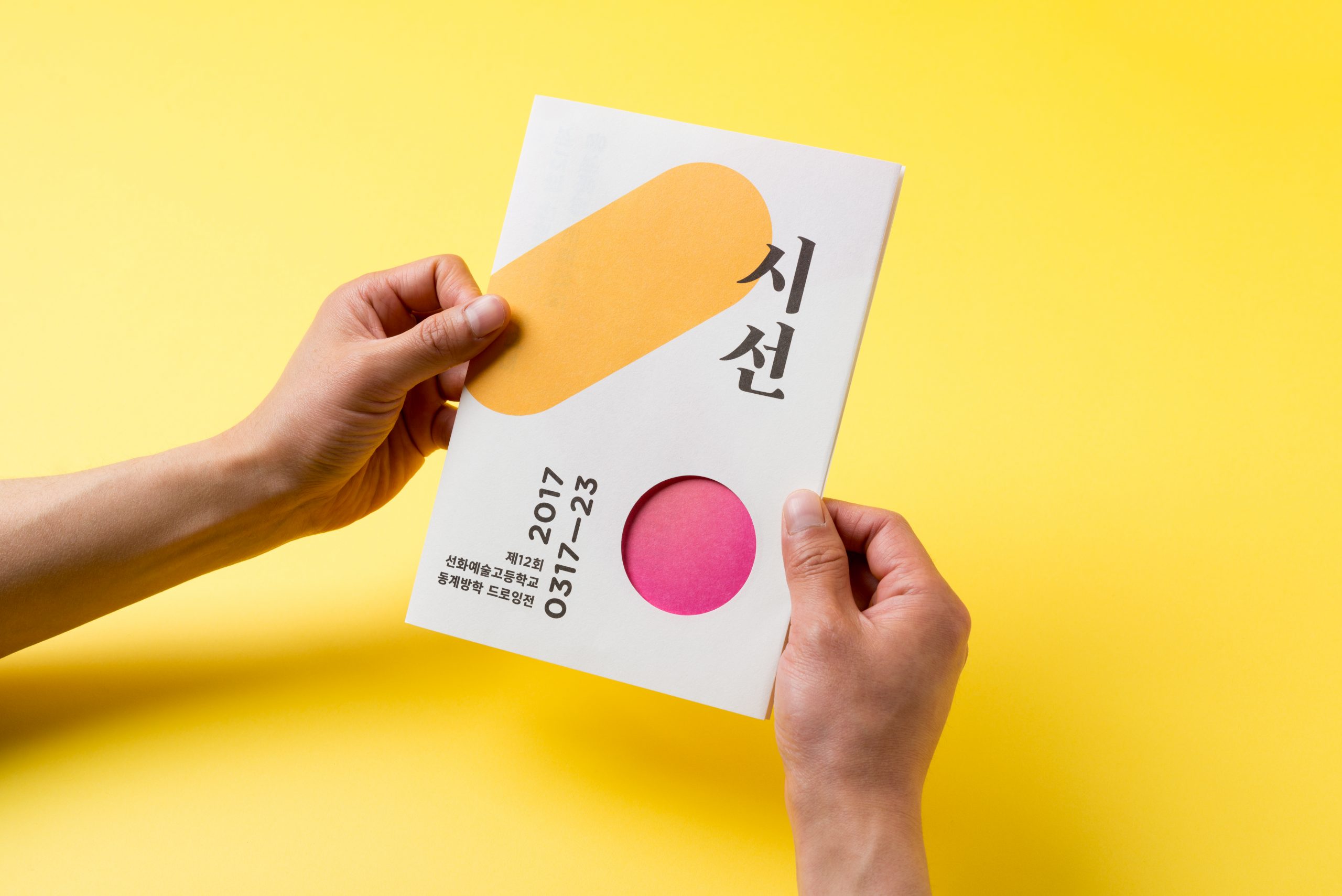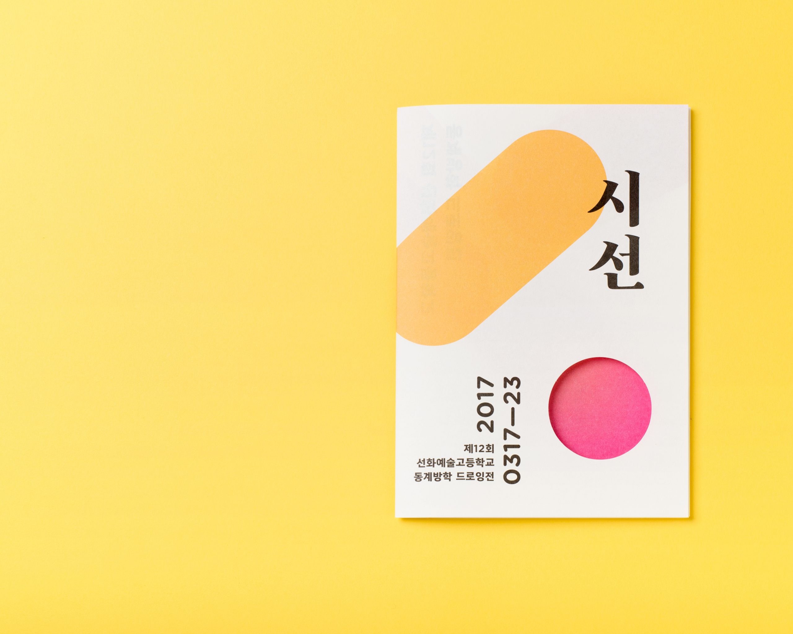 취그라프는 선화예술고등학교의 12회 선화예술고등학교 동계방학 드로잉전의 리플릿-포스터를 디자인했습니다. 드로잉전의 주제인 <시선>을 시각적으로 표현하기 위해, 시선의 흐름을 상징하는 그래픽 모티프를 제작하고 그 사이사이에 구멍을 뚫었습니다. 2차원의 그래픽 모티프는 시선의 흐름을 추상적으로 나타내며, 3차원의 구멍은 실제로 시선을 유도하는 역할을 합니다. 리플렛-포스터는 접혀 있을 때는 리플렛으로 기능하고, 펼치면 뒷면이 포스터로 활용되는 구조입니다. 페이지를 넘기거나 포스터로 펼쳤을 때, 앞면과 뒷면의 그래픽 요소들이 유기적으로 연결되도록 구성하였습니다.